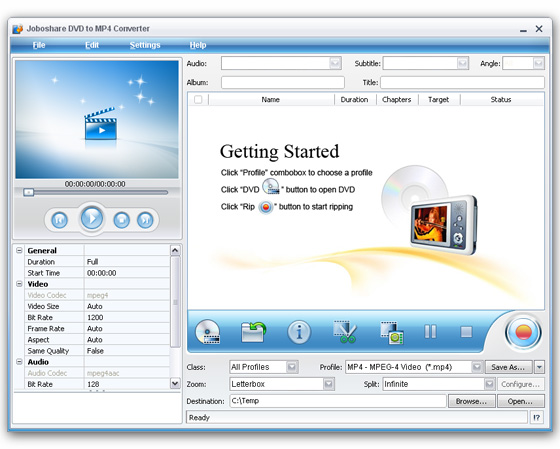 Joboshare DVD to MP4 Converter - является очень мощным DVD в MP4 конвертором с интуитивно понятным и удобным интерфейсом. Программа может конвертировать DVD в MP4, AVI, MPEG4, DivX, и XviD видео форматы с отличным качеством.