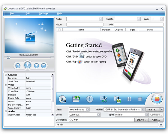 Joboshare DVD to Mobile Phone Converter - профессиональный DVD конвертор для мобильных телефонов, который поможет вам быстро скопировать и преобразовать DVD для мобильного телефона в 3GP, 3G2, MPEG-1, MPEG-2, MPEG-4, MP4, AVI видео форматы и конвертировать DVD для мобильного телефона в MP3, AAC, M4A, WAV аудио форматы, чтобы наслаждаться DVD на Apple iPhone, IPod, Sony PSP, Palm, Pocket PC, и на различных марках мобильных телефонов, включая Motorola, Nokia, Samsung, LG, Sony Ericsson и т.д.