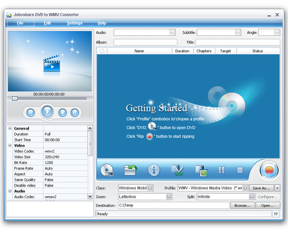 Joboshare DVD to WMV Converter - является очень мощным DVD в WMV и DVD в WMA конвертором с дружественным интерфейсом. Joboshare DVD to WMV Converter может преобразовывать DVD в видео WMV и копировать DVD в аудио WMA с отличным качеством видео и аудио.