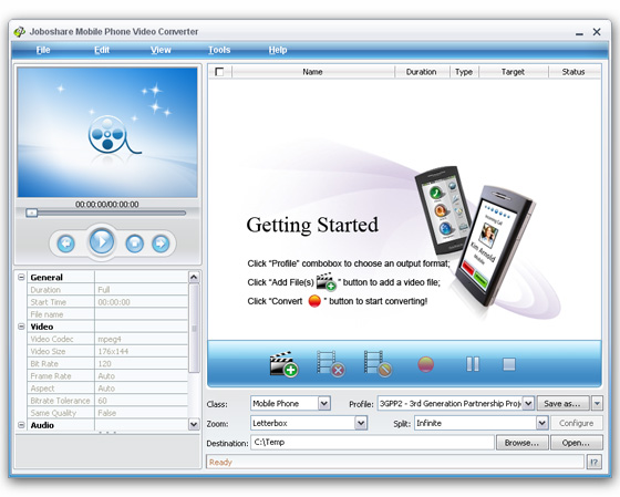 Joboshare Mobile Phone Video Converter - является профессиональным преобразователем видео для мобильных телефонов, который поможет вам быстро конвертировать видео для мобильного телефона в видео форматы 3GP, 3GPP, MP4, WMV, AVI, и извлечение звука из видео для мобильных телефонов в аудио форматы MP3, AAC, M4A, WAV, чтобы наслаждаться кино на Apple iPhone, IPod, Sony PSP, Palm, Pocket PC, а также на различных марках видеотелефонов, включая Motorola, Nokia, Samsung и Sony Ericsson и так далее.