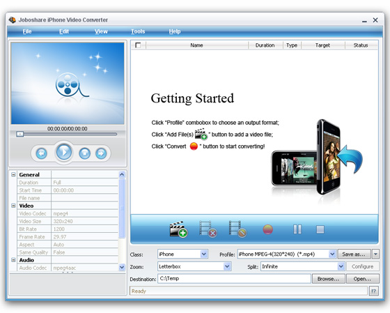 Joboshare iPhone Video Converter - является очень мощным и простым в использовании видео на iPhone и iPhone 3G конвертер, который может конвертировать все популярные видео файлы, WMV, RM, RMVB, MOV, DAT, VOB, MPEG, AVI, DivX, XviD, 3GP, и т.д., в iPhone фильмы MP4, широкоформатный iPhone MP4, iPhone MP4 видео 3G или iPhone 3G видео H.264 для воспроизведения на Apple iPhone, iPhone 3G, iPhone 3GS, iPhone 4 с различными настройками и очень быстрой iPhone скоростью преобразования фильмов.