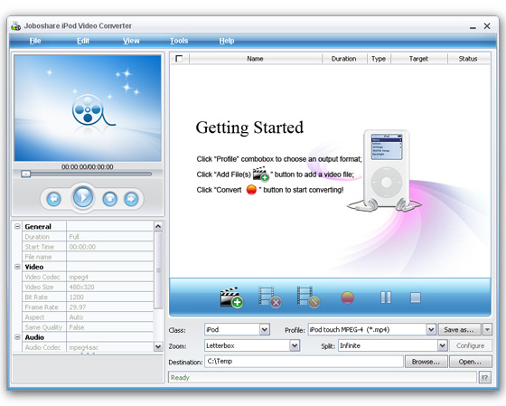 Joboshare iPod Video Converter - является мощным и профессиональным iPod видео конвертором, который может преобразовать практически все популярные видео файлы, включая AVI, DivX, XviD, MPEG, WMV, MOV, RM, RMVB, ASF, VOB, 3GP, H.264/MPEG-4 AVC для IPod MP4.