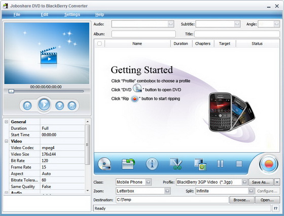 Joboshare DVD to BlackBerry Converter - лучший конвертер видео DVD для BlackBerry, может преобразовать DVD в BlackBerry AVI, 3GP, MP4, WMV видео форматы и извлекать из DVD аудио в аудио форматы BlackBerry MP3, AAC, WMA, для воспроизведения на BlackBerry Тур 9630, BlackBerry Storm 9530, BlackBerry Storm 9500, BlackBerry Bold 9000 , 8800 BlackBerry, 8820, 8830, BlackBerry Curve 8300, BlackBerry Pearl 8100 и т.д. с высокой скоростью преобразования и отличным качеством видео и аудио. Присутствует пакетный режим конвертирования.