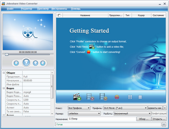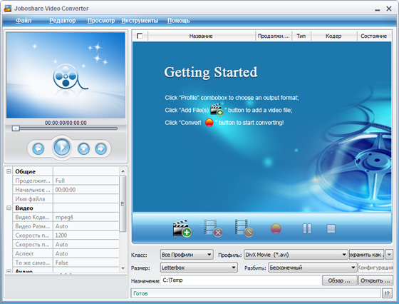 Joboshare Video Converter - Конвертер популярных видео форматов в форматы для мобильных устройств. Программа имеет возможность выбора и настройки параметров конвертирования, пакетный режим конвертирования, предварительный просмотр результата и другие функции. А высокая скорость работы и приятный, удобный интерфейс сделают Joboshare Video Converter незаменимым.