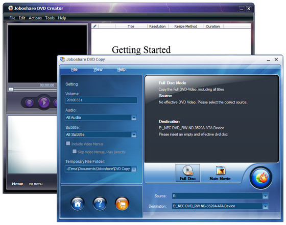Joboshare DVD Maker Bundle - это комплекс из двух программ для клонирования и создания резервных копий DVD, а также для конвертирования видео файлов и записи их на DVD с возможностью редактирования и создания меню, включающий Joboshare DVD Copy и Joboshare DVD Creator.