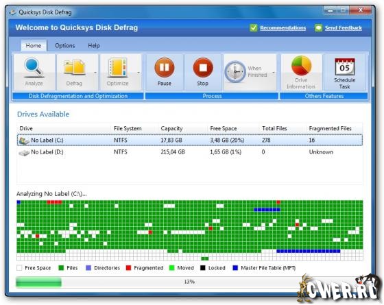 Quicksys DiskDefrag оперативно дефрагмантирует диски и разделы системы. В число функций входят оптимизация свободного пространства, установка размера блоков, обзор файлов в кластере, прерывание и остановка текущих процессов, информация о дисководе и карта кластера.