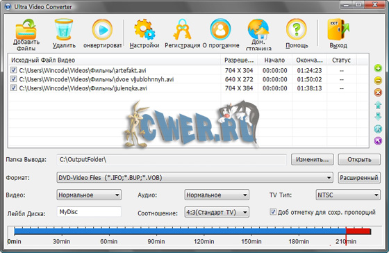 Ultra Video Converter - мощный и удобный инструмент для конвертирования, соединения и нарезки видео файлов, фрагментов, поддержка AVI, MPEG-1, MPEG-2, MPEG-4, VCD, SVCD, DVD, DivX, XVid, ASF, WMV и других видео форматов, выбор и настройка параметров конвертирования, нарезка и соединение отрезков с сохранением в выбранный формат и параметрами, подключение кодеков, поддержка файлов с размером больше 2GB.