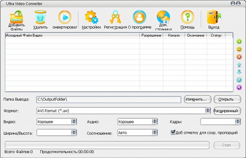 Ultra Video Converter - мощный и удобный инструмент для конвертирования, соединения и нарезки видео файлов, фрагментов. Особенности: поддержка AVI, DivX , XviD, MPEG, DAT, WMV, ASF, RM, RMVB, MOV, QT , MP4, M4V, 3GP, FLV, MKV и других видео форматов, выбор и настройка параметров конвертирования, нарезка и соединение отрезков с сохранением в выбранный формат и параметрами, подключение кодеков, поддержка файлов с размером больше 2GB, высокая скорость и высокое качество, простой и удобный интерфейс.