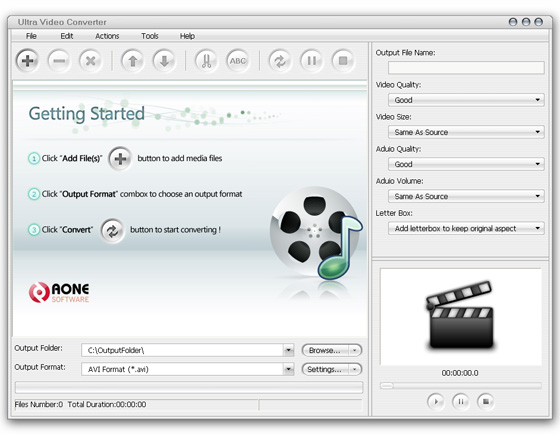 Ultra Video Converter - является мощным и удобным инструментом для конвертирования, соединения и нарезки видео файлов, фрагментов. Особенности: поддержка AVI, DivX , XviD, MPEG, DAT, WMV, ASF, RM, RMVB, MOV, QT , MP4, M4V, 3GP, FLV, MKV и других видео форматов, выбор и настройка параметров конвертирования, нарезка и соединение отрезков с сохранением в выбранный формат и параметрами, подключение кодеков, поддержка файлов с размером больше 2GB, высокая скорость и высокое качество, простой и удобный интерфейс.