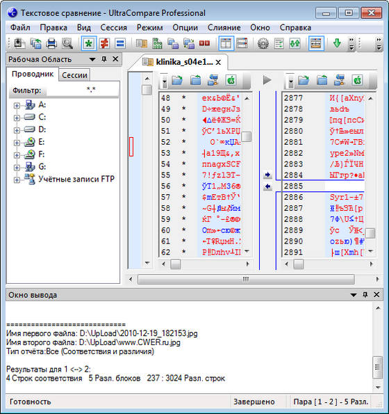 Программное обеспечение UltraCompare предназначено для сравнения содержимого текстовых файлов и папок. В число функций входят рекурсивное сравнение директорий, удаленное сопоставление файлов (FTP/SFTP) и папок, полная поддержка объединения файлов/директорий, поиск дублей и синхронизация папок.