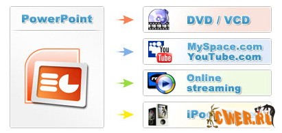 Wondershare PPT to Video это удобный конвертер презентаций PowerPoint в видео. Он поможет сконвертировать презентацию PowerPoint почти в любой видео формат: MPEG, AVI, MP4, WMV, MOV, 3GP в лучшем качестве. Программа поддерживает iPod, iPhone, Apple TV, Zune, PSP, Pocket PC, Black Berry и др. видео форматы.