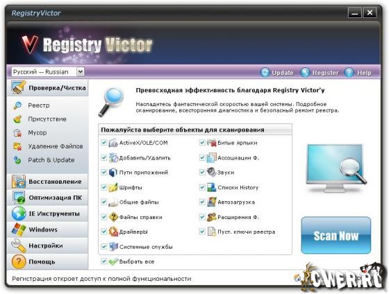 Registry Victor – программа для улучшения работы компьютера, которая находит ошибки, оптимизирует систему и ускоряет ее. Вы можете столкнуться с различными проблемами, которые постепенно появляются с использованием компьютера, например, замедление, зависание, «голубой экран смерти», постоянные сообщения об ошибках и т.д. Registry Victor использует только самые продвинутые технологии для сканирования ваших жестких дисков и дает вам наиболее полную диагностику всего за несколько секунд.
