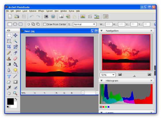 ArcSoft PhotoStudio - полнофункциональный пакет для обработки цифровых фотографий. В этом пакете собрана целая коллекция инструментов для редактирования и ретуширования фотографий в совокупности со средствами создания и наложения различных эффектов. Программа позволяет улучшать качество цифровых фотографий, убирать эффект "красных глаз", создавать анимированный 3D текст, поддерживает работу со слоями, позволяет подготавливать и распечатывать цифровые фотографии, содержит более 40 специальных эффектов (Oil Painting, Watercolor, Charcoal, Wet brush, Pastel, Impressionistic, Neon Edges, Bulge, Pinch, Stretch, Magic Mirror, Mosaic, Splash, Texture, Cool и т.д.)