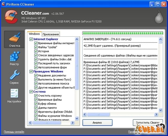 CCleaner - утилита для чистки мусора в операционной системе. В ходе своей работы Crap Cleaner ищет и удаляет временные и неиспользуемые файлы. Сюда относятся: cookies, история посещения сайтов в IE, временные файлы Интернета, строки поиска, файлы Корзины и т.д.