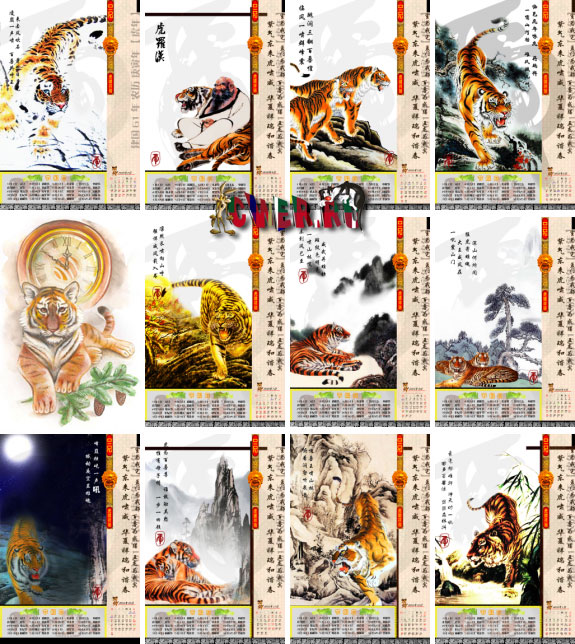 2010 год будет годом тигра. 11 иллюстраций из китайского календаря с изображениями тигра. Все PSD-исходники разбиты на слои (отключены). К сожалению, отсутствует 12-я иллюстрация и обложка. Но даже 11 символов нового года смогут помочь Вам в вашей работе.