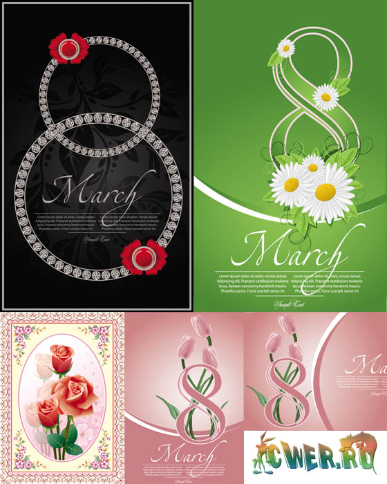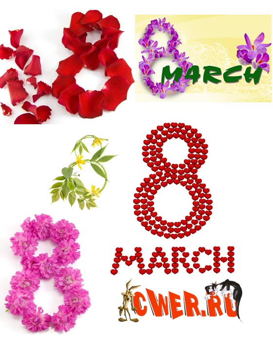 Коллекция графики к 8 марта. Все в векторе. Можно напечатать открытку, плакат, листовку. В комплекте много готовых текстов поздравлений в стихах.