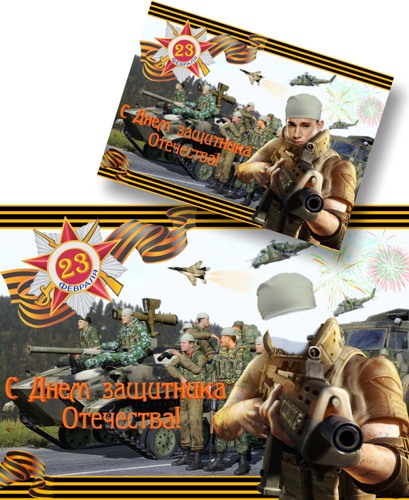 Великолепная открытка к 23-му февраля. Нужно только вставить фотографию в шаблон и можно сразу же нести распечатывать - до праздника как раз успеете.