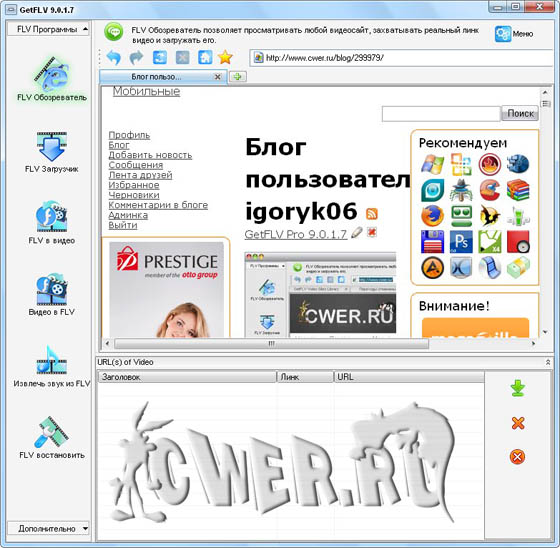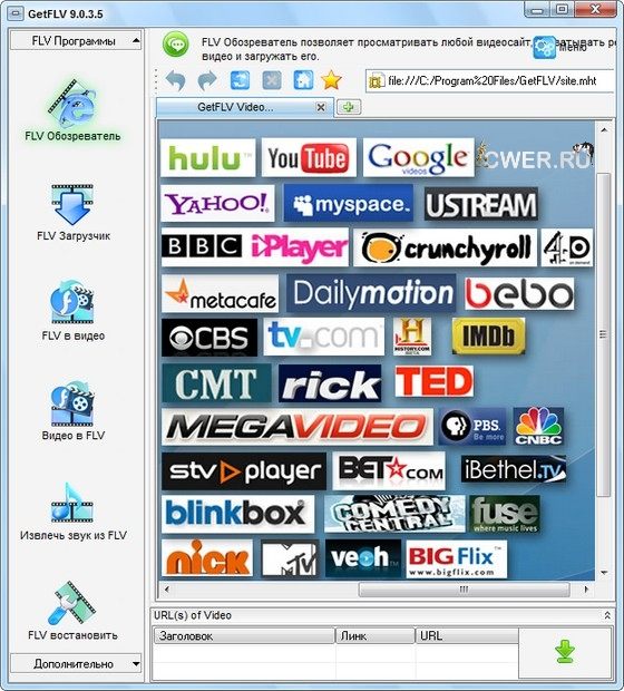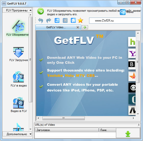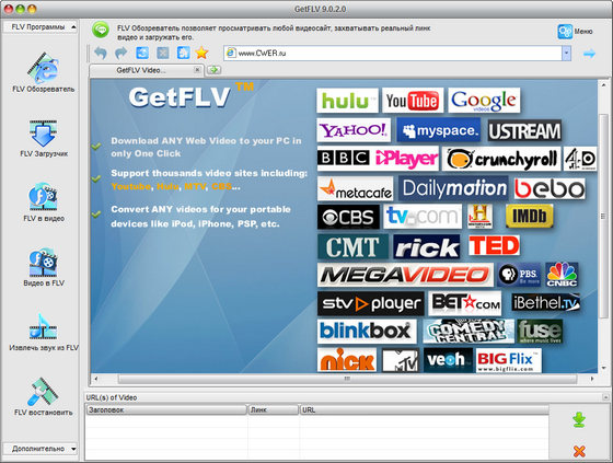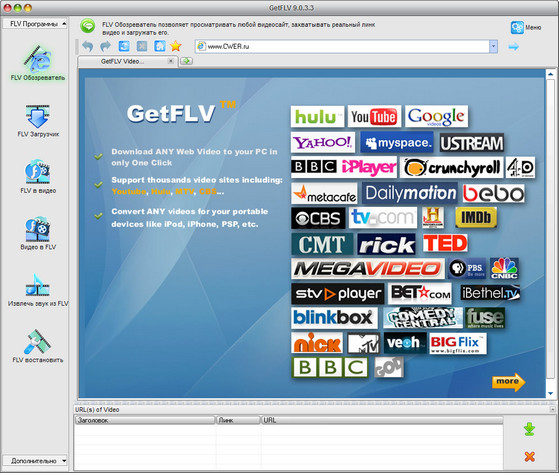 GetFLV Pro - новая версия программы, которая является полностью интегрированным набором мощных утилит для загрузки, управления, конвертирования, восстановления и воспроизведения FLV видео файлов.
