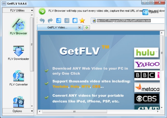GetFLV Pro - это сборник из 7 модулей, который позволяет производить весь спектр операций с .flv файлами. GetFLV Pro позволяет скачивать, управлять, конвертировать в различные форматы и из различных форматов, извлекать звук, восстанавливать и воспроизводить FLV видео.
