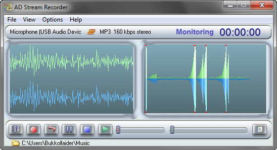 AD Stream Recorder - небольшая программа, позволяющая делать звукозаписи при этом визуализируя все происходящее в виде диаграмм. Программа поможет захватить запись из Интернета, звук из кинофильмов и музыки, которую воспроизводят популярные медиаплееры под Windows, а так же любой звук идущий с вашей звуковой платы в формат MP3 и WAV. Визуальное представление в реальном времени входных звуков в момент записи даст вам возможность сохранить их с высоким качеством.