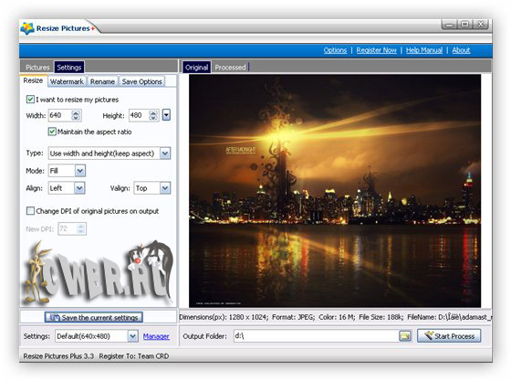 Resize Pictures Plus - простая в использовании программа для изменения размера и формата ваших фотографий в пакетном режиме. Позволяет пользователю в пакетном режиме изменить размер, качество, наложить водяной знак на картинку и конвертировать фотографии в один из форматов таких, как JPG, BMP, PNG, TIF, GIF, PCX и TGA. Прежде всего, программа подойдет для изменения фотографий с вашей фотокамеры, ведь большинство сфотографиованных изображений имеют большие размеры, а данная утилита позволит вам быстро и легко произвести все вышеуказанные операции в пакетном режиме, т.е. вам всего-лишь нужно выбрать фотографии, настроить выходные параметры изображений и нажать кнопку запуска процесса. В результате, вы сможете передать ваши фотографии друзьям, поместить их в блоге или на форуме. Имеет простой и понятный пользовательский интерфейс, поэтому подойдет для большинства пользователей и не вызовет проблем при использовании.