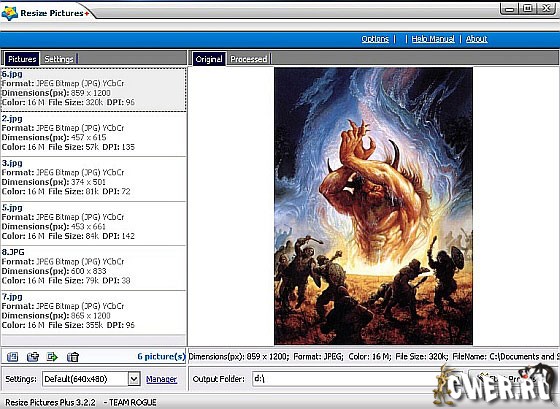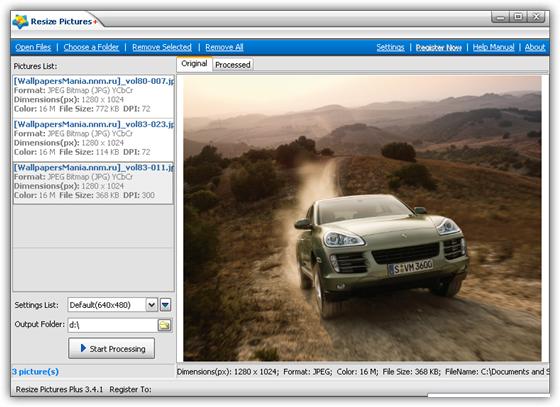 Resize Pictures Plus - простая в использовании программа для изменения размера и формата ваших фотографий в пакетном режиме. Позволяет пользователю в пакетном режиме изменить размер, качество, наложить водяной знак на картинку и конвертировать фотографии в один из форматов таких, как JPG, BMP, PNG, TIF, GIF, PCX и TGA.