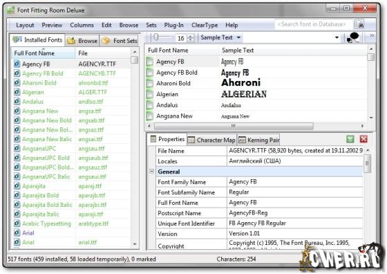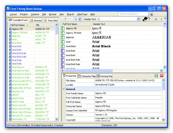 Font Fitting Room - это мощный менеджер шрифтов с предварительным просмотром,который поможет тем, у кого имеются обширные коллекции шрифтов. Предназначен для удаления, добавления и организации шрифтов различных форматов. Поддерживает все типы шрифтов, которые используются на компьютерах.