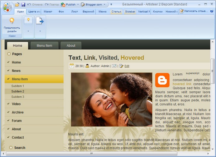 Artisteer - первый и единственный автоматизированный продукт для веб-дизайна, способный мгновенно создать уникальные шаблоны веб-страниц и темы блогов. С помощью Artisteer вы сразу станете экспертом в области веб-дизайна, редактирования и нарезки графики, написания кода XHTML и CSS и создания шаблонов веб-страниц, шаблонов Joomla, тем Drupal и Wordpress, скинов DotNetNuke и шаблонов Blogger за считанные минуты, без использования Photoshop и Dreamweaver и без технической подготовки.