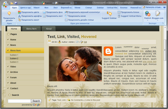 Artisteer - первый и единственный продукт автоматизации веб дизайна, который моментально создает фантастического вида, уникальные шаблоны для СMS Joomla, Drupal, Wordpress, темы для вашего блога или HTML-странички. Проектируйте удивительные темы для Wordpress и создавайте профессиональные вебсайты в считанные минуты. Удобный в использовании. Не требующий знаний Photoshop, CSS, HTML. Экспорт тем в Wordpress, Joomla, Drupal или шаблонов для CMS.