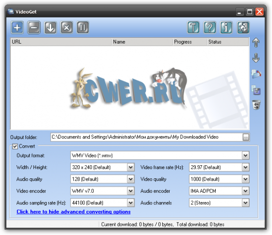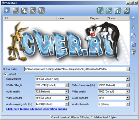 VideoGet - это программа для скачивания видео клипов с больше чем 100+ видео веб-сайтов (YouTube, Yahoo Video, MySpace, VSocial, Metacafe, и много-много других). Многие из этих веб-сайтов держат видео в FLV формате, и большинство людей не знает как проигрывать эти файлы VideoGet также позволит вам конвертировать все видео в множество популярных форматов для более комфортного проигрывания VideoGet поддерживает AVI, MPEG1, MPEG2, WMV, FLV, MP4, 3GP, MP3 форматы, так что вы имеете возможность не только посмотреть видео на своем компьютере, но и переписать его на свой iPod, мобильный телефон или любой другой портативный прибор. Кроме того вы самостоятельно можете задавать настройки конвертации.