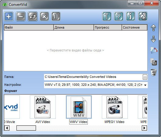 ConvertVid - программа для конвертирования видео файлов из одного формата в любой другой (например с AVI в MP4 или с FLV в DivX). Программа поддерживает все популярные видео кодеки и форматы, такие как DivX, XVid, AVI, WMV, MPEG1, MPEG2, MP4, H.264, FLV, RealVideo, QuickTime и 3GP. Кроме конвертирования видео в другие форматы вы сможете легко конвертировать любое видео на ваш iPod Video, iPod Nano, iPod Touch, PSP, Zune, iRiver Clix, AppleTV или мобильный телефон.
