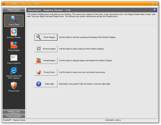 CleanMyPC Registry Cleaner сканирует системный реестр операционных систем Windows на предмет обнаружения и удаления некорректных, поврежденных или неработающих ссылок и записей. Данная процедура позволяет поддерживать работоспособность ОС на достаточно высоком уровне и избегать непредвиденных сбоев в работе ПК. Присутствует опция создания резервных копий реестра, так что вы всегда можете отменить все сделанные изменения и вернуться к наилучшей конфигурации. Также утилита позволяет с легкостью управлять программами и BHO (Browser Helping Object), автоматически загружаемыми в момент запуска Windows и Internet Explorer.