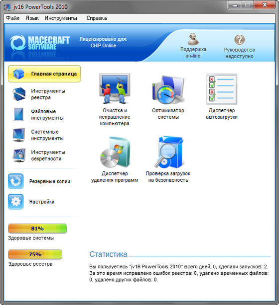 jv16 PowerTools 2011 - программа, представляющей собой набор утилит для комплексной работы с реестром (очистка, правка, автозагрузка, установка/удаление, мониторинг системного реестра, поиск - замена), файлами (поиск дубликатов, органайзер файлов), очистка дисков и управление компьютерами в локальной сети. В отличие от более ранних версии в новой улучшен интерфейс, произведены различные оптимизации и доработки, добавлено несколько востребованных пользователями возможностей.