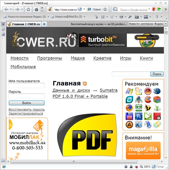 Японский интернет-браузер Lunascape поддерживает сразу три наиболее популярных движка для обработки и вывода веб-страниц – Gecko (используется в Firefox), Trident (используется в Internet Explorer) и WebKit (применяется браузерами Safari и Chrome). Авторы браузера позиционируют его как альтернативу установке нескольких программ для веб-серфинга на один компьютер.
