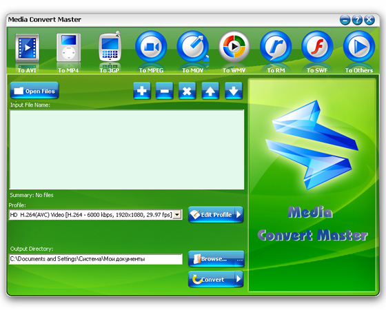 Media Convert Master - профессиональный аудио/видео-конвертер, конвертирует ваши аудио- и видео- файлы из одного формата в другой. Поддерживается мультиформатное конвертирование, в частности AVI, MP4, 3GP, MPEG, MOV, WMV, RM, SWF, AAC, AC3, MP2, MP3, AMR, WAV, VOB and ASF. Экстремально профессиональное конвертирование с наиболее высоким качеством и скоростью! Благодаря простоте в управлении программа позволяет пользователю наслаждаться процессом конвертирования файлов.