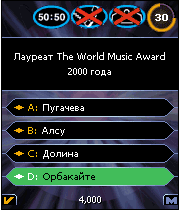 Игра для мобильных телефонов. Игра (Кто хочет стать миллионером?) – прекрасная возможность пережить еще и еще раз всю напряженность атмосферы одноименного телешоу, известного во всем мире. Популярность игры обусловлена гармоничным сочетанием приятного с полезным: здесь можно протестировать свою эрудицию и пополнить свой кошелек еще одним миллионом. Размеры экранов: 128х128, 128х160, 130х130, 132х176, 176х208, 176х220, 240х320.