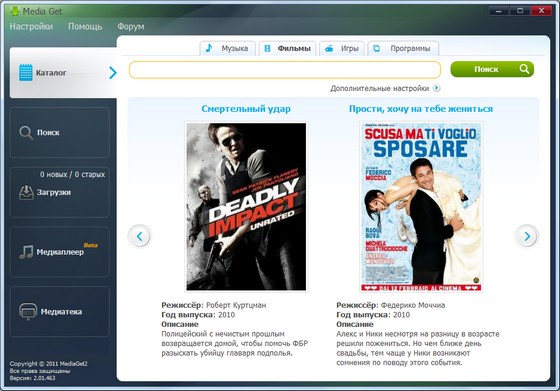 MediaGet - утилита для поиска и скачивания медиафайлов на открытых торрент-трекерах. Каждый человек, пользующийся интернетом, привык скачивать из сети различную музыку, фильмы или игры напрямую с сервера. Но бывают ситуации, когда на любимом сайте искомый файл отсутствует по каким-либо причинам... В этих случаях на помощь приходит замечательный сервис MediaGet, который откроет вам доступ в мир закрытых пиринговых сетей, в которых возможно найти практически любой нужный вам файл. Будь то редкая музыка, недавно вышедший фильм или любая программа - всё это можно скачать с помощью MediaGet. Программа поддерживает огромное количество открытых торрент-трекеров, вы без труда найдете нужный вам файл и скачаете на максимальной скорости.