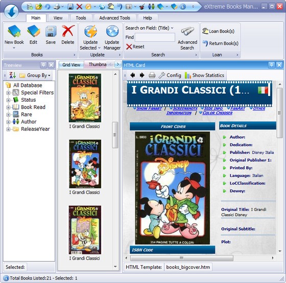 eXtreme Books Manager - это, возможно, самый лучший менеджер коллекций книг. Программа сможет импортировать информацию о книгах из многих специализированных сайтов, для этого Вам понадобиться только указать название книги либо указать отсканированный штрих код ISBN.