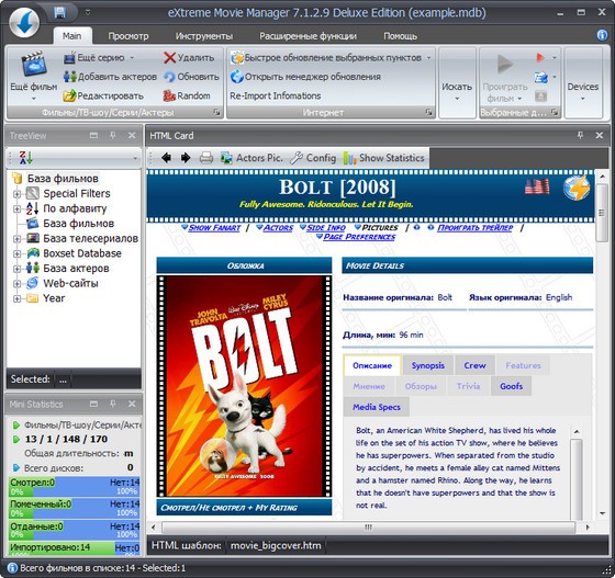 eXtreme Movie Manager - прекрасная программа, с помощью которой можно вести домашнюю фильмотеку. Для каждого фильма можно использовать около 70 полей описания, которые разделены по группам. Программа также поддерживает импорт данных с кино-сайтов. Доступны все существующие форматы файлов - от *.avi и *.mpg до RealMedia. Также eXtreme Movie Manager позволяет воспроизводить видеофайлы, искать на винчестере мультимедийные файлы указанного разрешения и каталогизировать их.