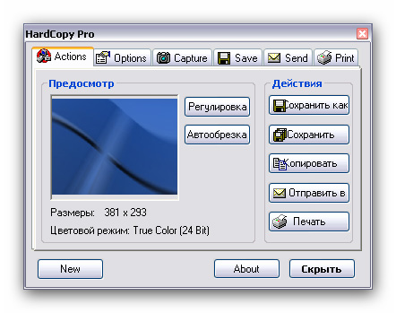 HardCopy Pro - многосторонняя и простая в использовании утилита для захвата экрана в операционных системах Windows. Позволяет захватывать прямоугольные области или полные окна. Снятые изображения могут быть с легкостью обрезаны и изменена глубина цвета в любую заданную величину от монохрома до полноцветного изображения. Изображения могут быть распечатаны, сохранены, копированы в буфер обмена, отправлены по электронной почте, отредактированы любым графическим редактором и многое другое. Множество опций программы позволяют пользователю настраивать все эти действия так, как этого захочет сам пользователь.