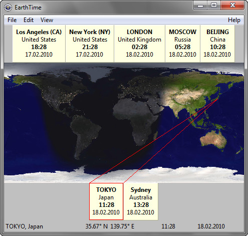 EarthTime - программа для показа локального времени и даты любого места земного шара. Программа имеет встроенную базу данных более 3000 городов Земли, а также позволяет пользователю добавлять любое количество собственных локаций. Позволяет устанавливать будильники на любое локальное время любого города нашей планеты. Множество опций в данной программе предоставляют пользователю гибкие настройки часовых поясов и локального времени.