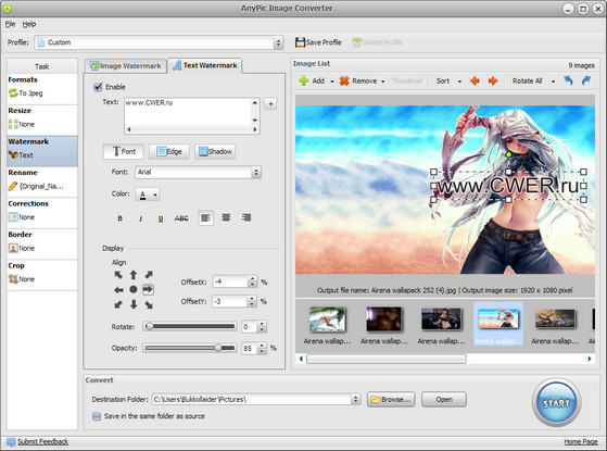 AnyPic Image Converter - это удобный инструмент для пакетной конвертации и обработки изображений. Программа позволит вам конвертировать изображения в различные форматы, изменять размер изображений, поворачивать, обрезать их, добавлять водяные знаки, накладывать различные эффекты и рамки на сотни фотографий одновременно. Всего один щелчок мыши и ваши фотографии идеальны для размещения на вашем веб-сайте или блоге, на Facebook, MySpace и т.д.