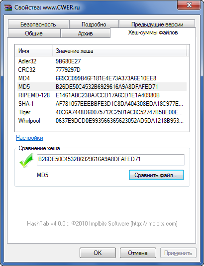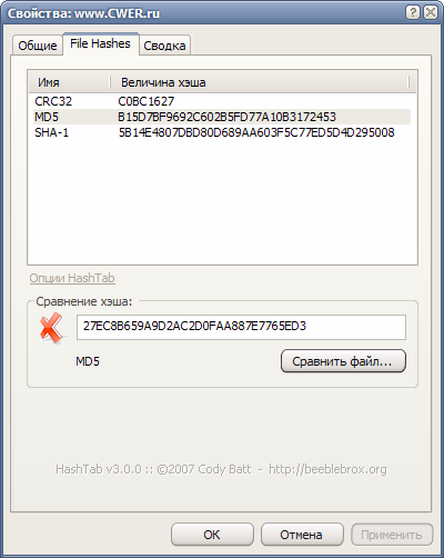 Программа для определения контрольных сумм загруженных файлов. Интегрируется во вкладку свойств Проводника. Позволяет определить путем сравнения контрольных сумм MD5 файлов, поврежден файл или нет. Если суммы не совпадают, необходимо загружать файл заново. Особенно актуально для больших архивов, сборок Windows. Настоятельно рекомендуется для всех пользователей Интернета.