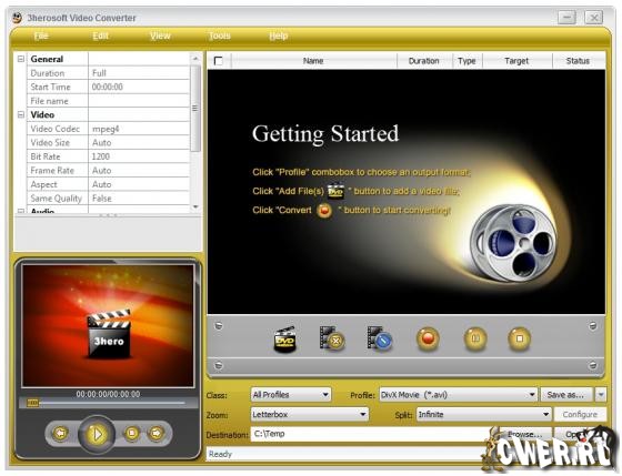 3herosoft Video Converter - мощный и простой в использовании видео конвертер, который может конвертировать между всеми популярными видео и аудио форматами с высокой скоростью преобразования. Преобразовывает AVI в MPEG, WMV в AVI, WMV в MPEG или видео H.264/AVC, 3GP в MPEG и т.д. 3herosoft Video Converter поддерживает практически все популярные портативные устройства, такие как IPod, iPhone, PS3, PSP, Xbox, Apple TV, Zune, Creative Zen, Blackberry, мобильные телефоны, Archos, Pocket PC и т.д.