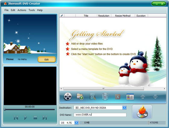 3herosoft DVD Creator - программа для cоздания видео Blu-Ray, DVD, CD. Создание полноценных видео DVD проектов с прожигом (записью) на DVD носитель, создание видео DVD из AVI, MPEG, DAT, MPG, WMV, ASF, MP4, VOB и других видео форматов, создание полноценных меню и субтитров, выбор из стандартных или собственная настройка.