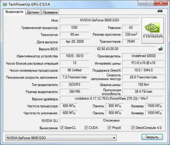 Вышла новая версия программы для вывода информации о графическом адаптере. GPU-Z поддерживает и карты NVIDIA, и ATI. Она поможет определить, какая у вас модель видеокарты, узнать интерфейс подключения, расскажет о том, какой используется графический процессор (версия BIOS, номер ревизии чипа, частота в 2D, 3D-режимах и при разгоне, сведения о поддержке DirectX).