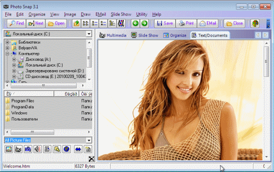 Photo Snap является средством просмотра изображений и мультимедиа-файлов, которое помогает Вам быстро определять местонахождение картинок, фильмов, позволяет редактировать, печатать и посылать/получать изображение/графические файлы.
