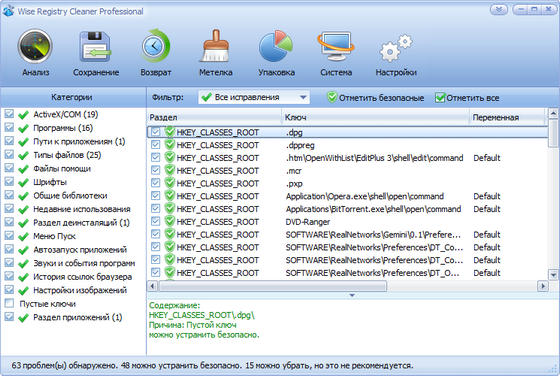 Wise Registry Cleaner Free - бесплатная версия безопасной утилиты для чистки реестра Windows. Программа сканирует реестр и ищет в нем некорректную и устаревшую информацию, после удаления которой операционная система работает более быстро. После того, как программа проанализирует проблемы вашей системы, вы можете сами просмотреть каждую найденную неполадку и посмотреть ее детальное описание. Имеется возможность автоматической корректировки таких проблем. Все изменения, внесенные программой в реестр, могут быть отменены за два клика мышью. Также стоит отметить, что интерфейс программы переведен на множество языков, включая русский язык.